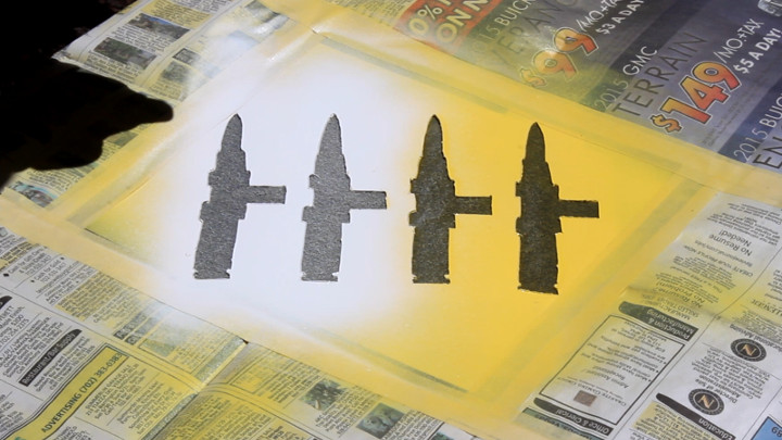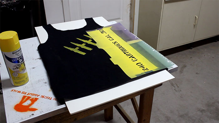 Because I thought the yellow paint might not show up that well on the black shirt, I sprayed 2 coats of Rustoleum white paint first and then 2 coats of Rustoleum yellow paint.