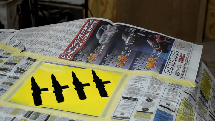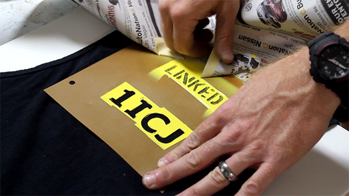 After you position the stencil on the shirt, use tape and newspaper to mask off anything you don’t want to paint.