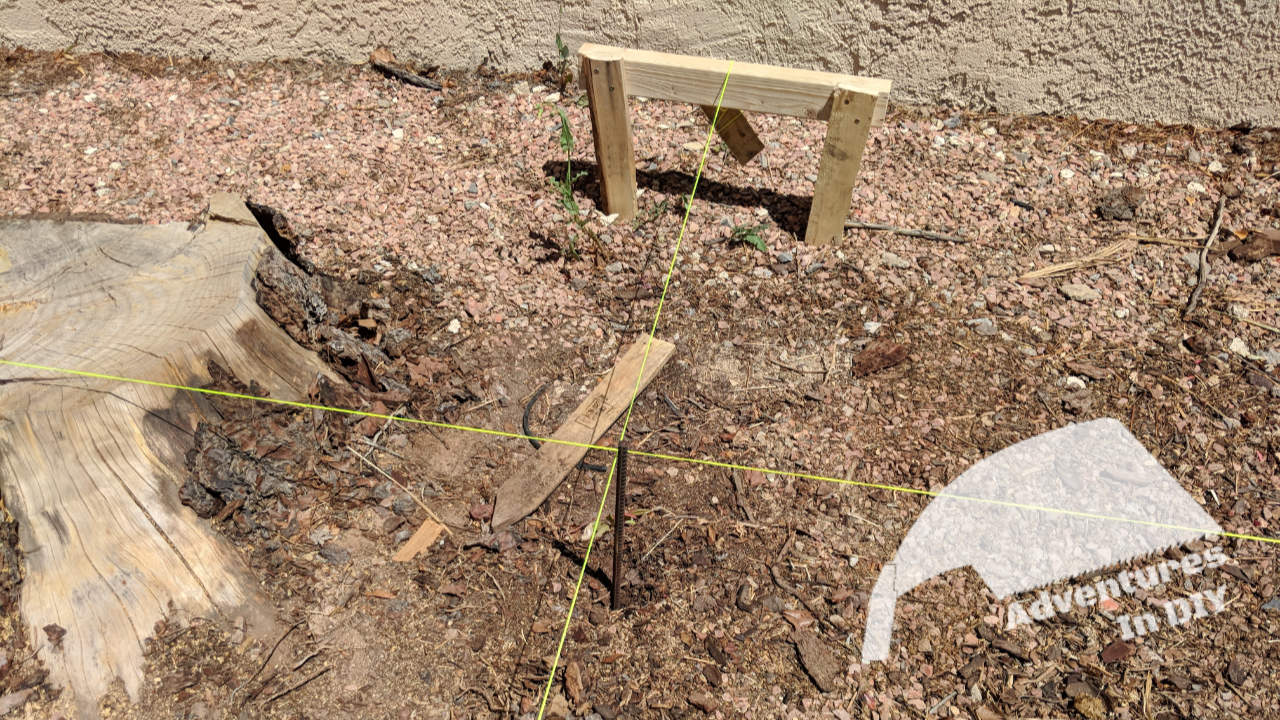 At first I did a basic layout with some spray paint and basic stakes and string, and dug out a basic trench. There is a height difference of 8 inches from the lowest point to the highest. To make this area level we had to make a retaining wall. Because of this, I realize we needed a more accurate way to define the area we’d be working in.